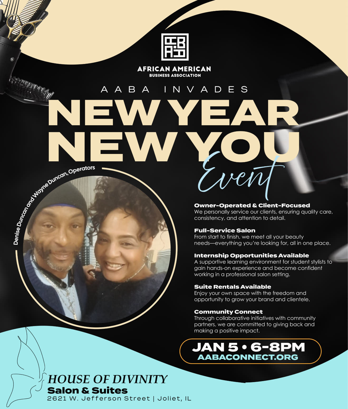 Join AABA as we invade, House of Divinity Salon and Suites for our New Year; New You Event! Join owners & operators Denise and Wayne Duncan as they open their doors for their full-service salon suites. Come and learn how they provide a dynamic learning environment for student stylists to become accustomed to working in a salon. They also have Suite Rentals Available as for stylists to have their own space and opportunity to grow. Don't forget to come and network and plan to bring your business cards so you can enter in a chance to win big! Community Connect We have a collaborative initiative with several community partners to continuously give back within the community.